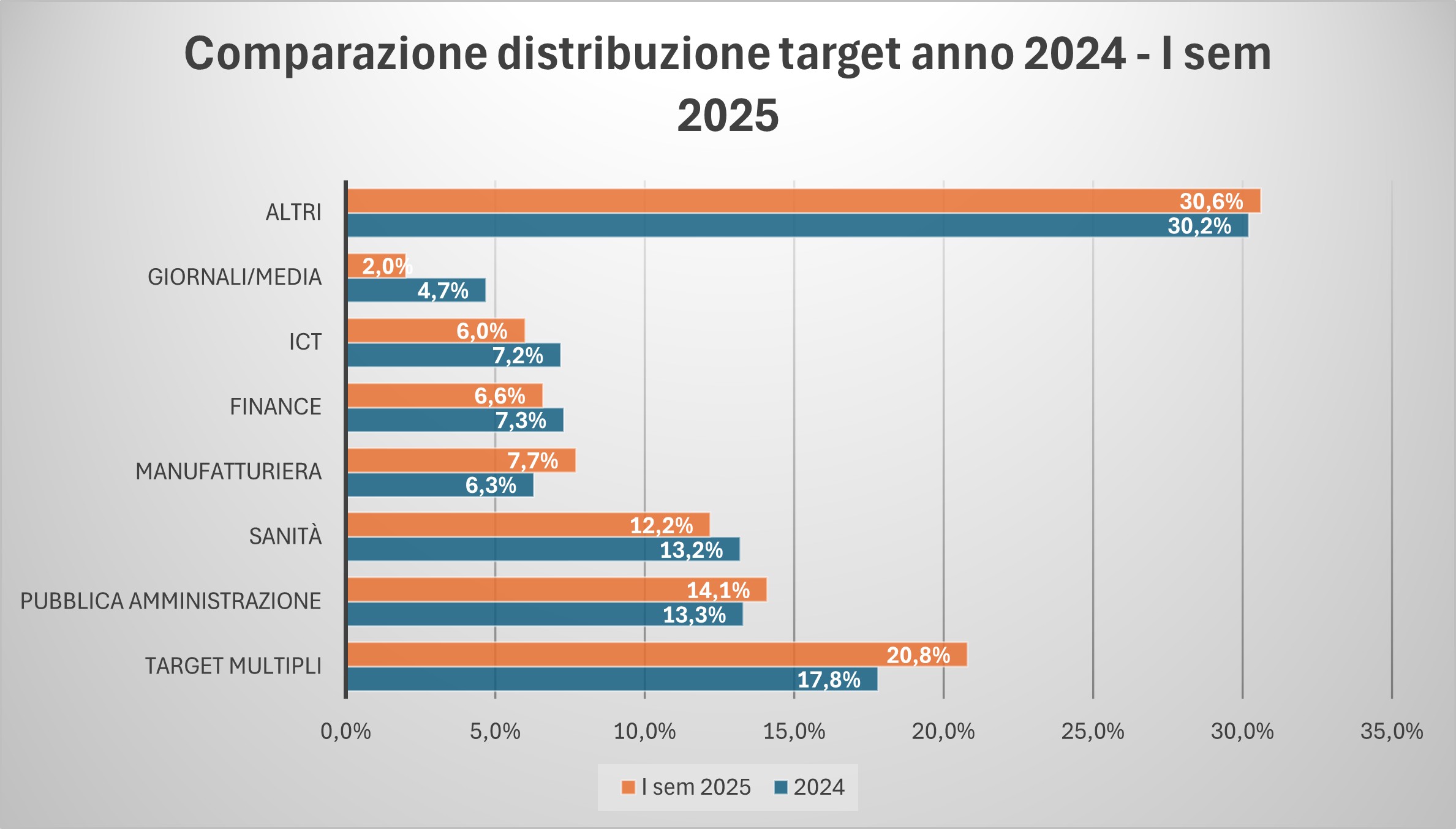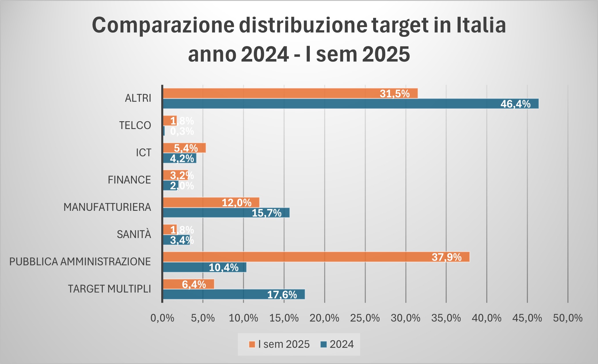 Nella distribuzione per target l'aumento degli attacchi alla Pubblica Amministrazione nel I semestre 2025 è impressionante: + 27,5%.