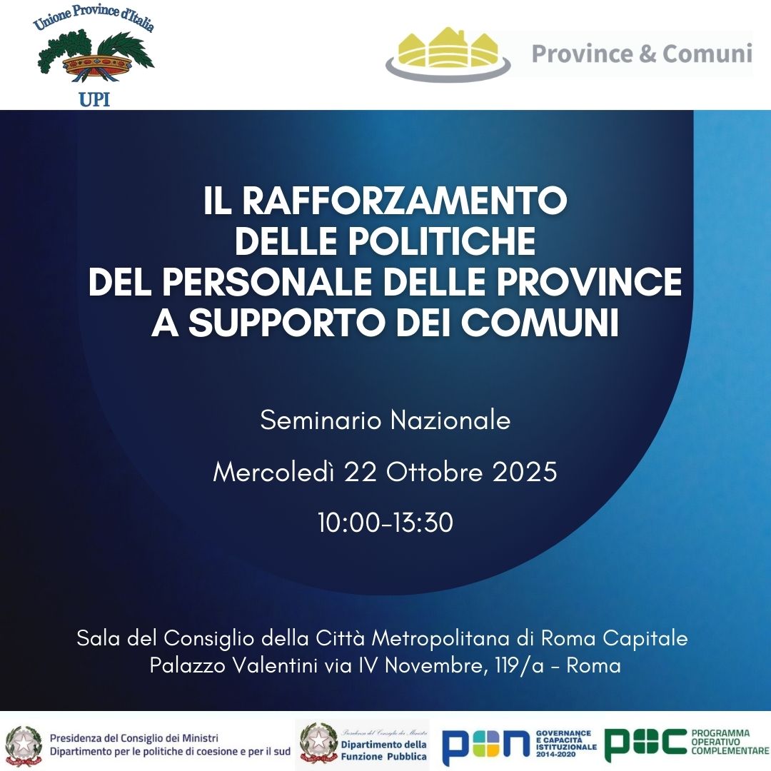 PROGETTO “PROVINCE & COMUNI”: CONVEGNO A ROMA 22 OTTOBRE 2025 “IL RAFFORZAMENTO DELLE POLITICHE DEL PERSONALE DELLE PROVINCE A SUPPORTO DEI COMUNI”.